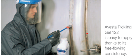 - Restaura superficies de acero inoxidable dañadas, como costuras de soldadura, eliminando óxidos de soldadura, la capa subyacente empobrecida en cromo y otros defectos que pueden causar corrosión local.